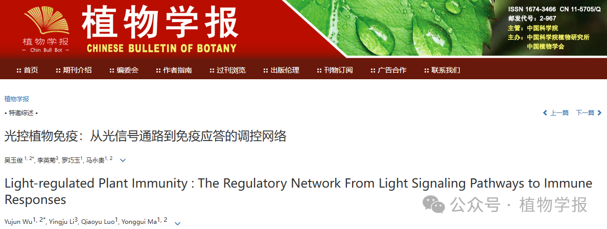 近日,公司世界杯8833300足球吴玉俊副教授受邀在国内植物学领域顶级期刊《植物学报》发表了题为“光控植物免疫:从光信号通路到免疫应答的调控网络”的长篇特邀综述论文。该论文系统总结了光受体及其下游信号元件整合调控植物生长发育与免疫的作用机制,深化了植物抗病免疫领域对光控植物免疫信号转导的认识,也为抗病作物育种提供了新思路和新方向。同时,该文章还展望了光遗传学技术在解析光信号与免疫信号交互作用机制中的应用潜力,为基于光信号调控元件的抗病作物分子设计育种,提供了全新的理论依据和技术路径。