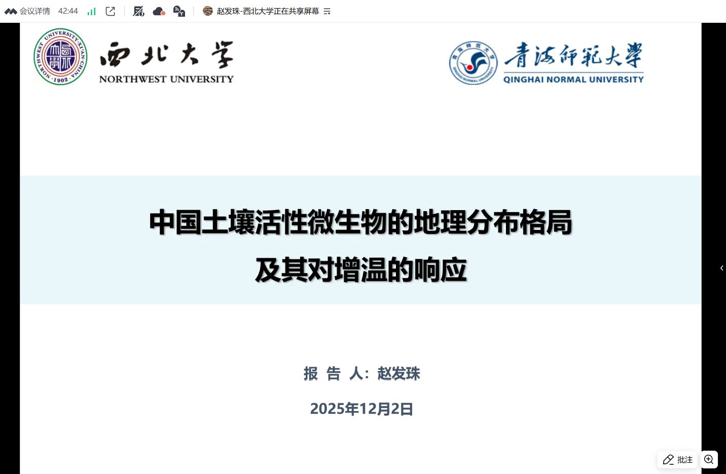 2025年12月2日晚,西北大学城市与环境公司赵发珠教授应青海省青藏高原生物多样性形成机制与综合利用重点实验室邀请,在线上作了题为《中国土壤活性微生物的地理分布格局及其对增温的响应》的学术讲座。本次讲座由世界杯8833300足球关晋宏副教授主持,吸引了公司师生共计约50余人参与。