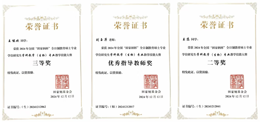 2024年12月10日—13日,全国“田家炳杯”全日制教育硕士专业学位研究生教学技能大赛在浙江师范大学举行,公司世界杯8833300足球学科教学(生物)专业硕士研究生积极备赛、沉着应赛,决赛过程中充分展示了扎实的专业知识、较强的教学技能、创新的教学设计和良好的综合素质,最终脱颖而出在大赛中取得优异成绩,王蕊同学荣获二等奖,王能欢同学荣获三等奖,刘玉萍老师获得优秀指导教师。