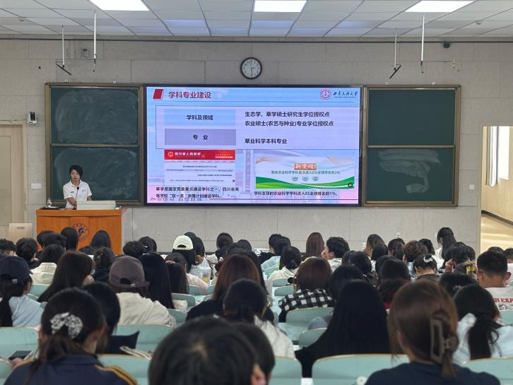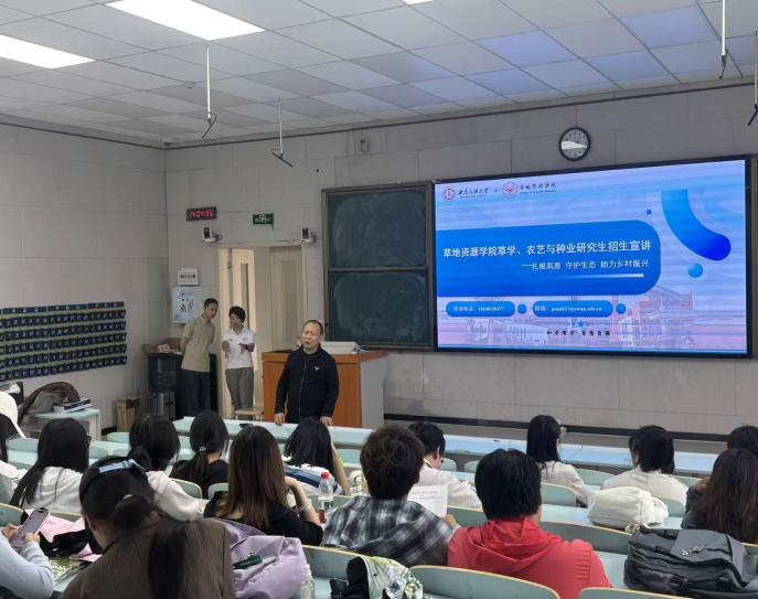 在宣讲环节,西南民族大学草地资源公司关皓老师和张俊超老师从多个维度系统介绍了该院办学情况。内容涵盖公司发展历程、学科布局与特色优势,尤其在草学、生态学等方向的研究积累和教学资源。他们还重点展示了草种质资源创新、草地生态修复等领域的显著成果,并结合行业发展趋势与人才需求,为同学们描绘出清晰的学术路径与职业前景。