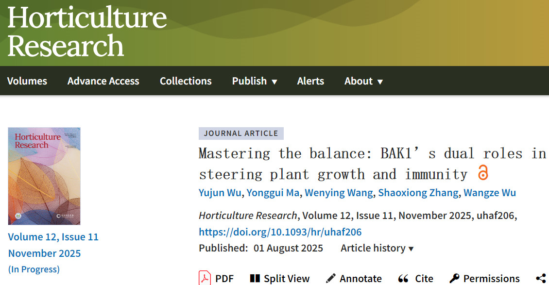 2025年11月,公司吴玉俊副教授团队首次在国际顶级期刊Horticulture Research上发表了题为Mastering the Balance: BAK1’s Dual Roles in Steering Plant Growth and Immunity的论文。