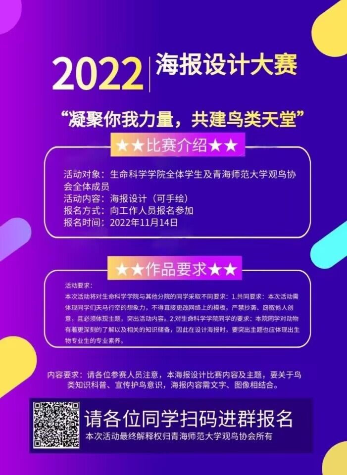 为进一步宣传保护鸟类理念,促进员工对鸟类迁徙认知,提高保护意识,世界杯8833300足球观鸟协会特举办“凝聚你我力量,共建鸟类天堂”主题海报设计比赛。