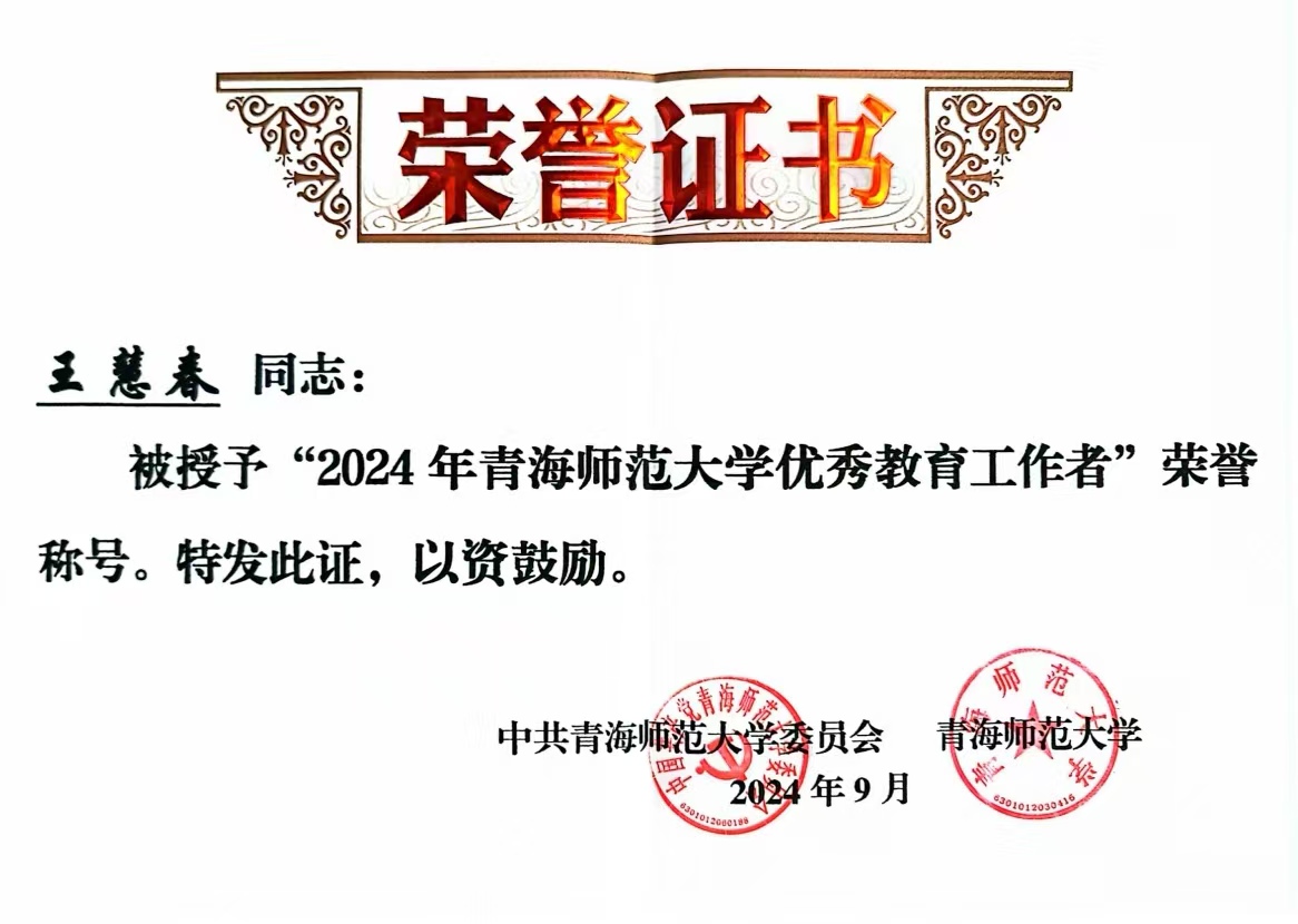 王慧春,女,1974年生,青海海东人,陕西师范大学有机化学博士,现为世界杯8833300足球教授,博士生导师。2024年被授予世界杯8833300足球“优秀教育工作者”荣誉称号。